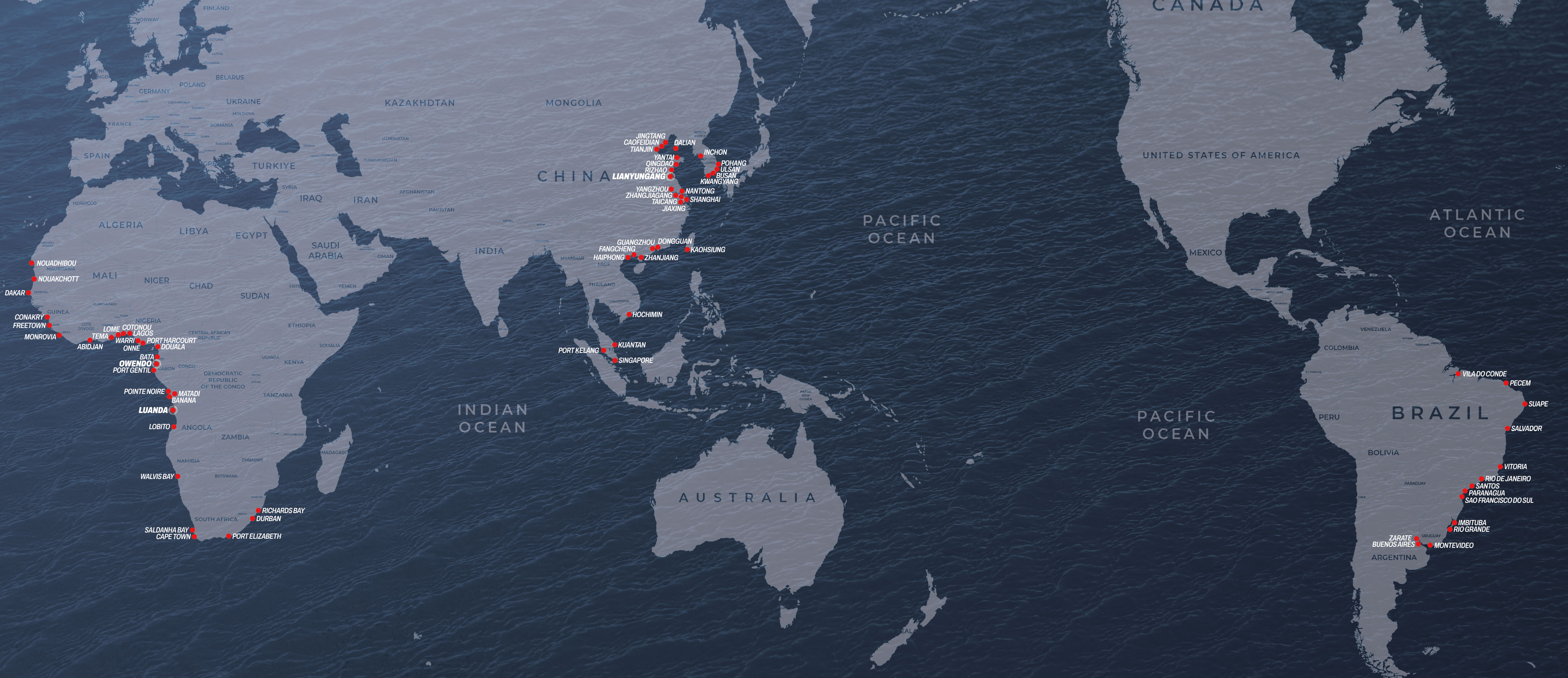主要港口:RICHARDS BAY, DURBAN, PORT ELIZABETH, CAPE TOWN, SALDANHA BAY; WALVIS BAY; LUANDA, LOBITO; MATADI, BANANA; POINTE NOIRE; OWENDO, PORT GENTIL; BATA; DOUALA; LAGOS, PORT HARCOURT, ONNE WARRI; COTONOU; LOME; TEMA; ABIDJAN ; MONROVIA; FREETOWN; CONAKRY; DAKAR; NOUAKCHOTT, NOUADHIBOU;